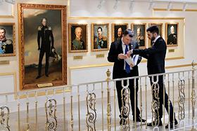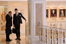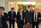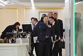 Пленарное заседание Совета Федерации России. Сенаторы перед заседанием Совета Федерации России. Жанровая фотография. В холле здания Совета Федерации.
