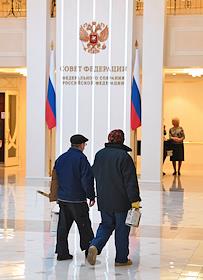 Пленарное заседание Совета Федерации России. Сенаторы перед заседанием Совета Федерации России. Представитель от законодательного (представительного) органа государственной власти Красноярского края Валерий Семенов (в центре) перед началом заседания.