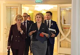 Пленарное заседание Совета Федерации России. Сенаторы перед заседанием Совета Федерации России. Представитель в Совете Федерации от исполнительного органа государственной власти Республики Башкортостан Лилия Гумерова (вторая справа) перед началом заседания.