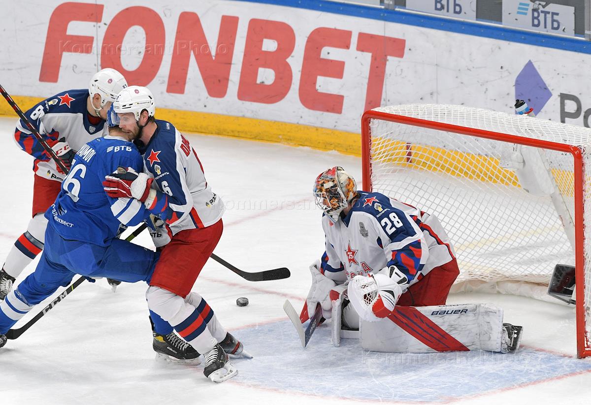 Континентальная хоккейная лига (КХЛ). Чемпионат сезона 2021/22. 1/2 финала - Запад. Матч между командами "Динамо" (Москва) - ЦСКА (Москва) на стадионе "ВТБ Арена". Игрок команды "Динамо" Богдан Якимов (в центре) и вратарь команды ЦСКА Иван Федотов (второй справа) во время матча.
