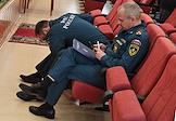 Итоговая коллегия Федеральной службы по гидрометеорологии и мониторингу окружающей среды (Росгидромет). Жанровая фотография. Сотрудники МЧС России перед началом коллегии.