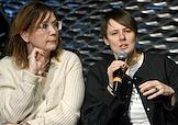 Дискуссия на тему "Человек без имени. Законы тотального института" в Еврейском музее и центре толерантности. Президент Благотворительного Фонда "Волонтеры в помощь детям-сиротам" Елена Альшанская (слева) и директор Региональной благотворительной общественной организации "Центр лечебной педагогики", ведущий логопед, член Экспертного совета Центра Лечебной Педагогики Анна Битова (справа) во время дискуссии.