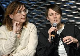 Дискуссия на тему "Человек без имени. Законы тотального института" в Еврейском музее и центре толерантности. Юрист благотворительной общественной организации "Перспективы" Екатерина Таранченко (слева) и директор Региональной благотворительной общественной организации "Центр лечебной педагогики", ведущий логопед, член Экспертного совета Центра Лечебной Педагогики Анна Битова (справа) во время дискуссии.