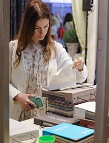 27-я выставка строительных и отделочных материалов MosBuild в международном выставочном центре "Крокус Экспо". Посетительница с мобильным телефоном на выставке.