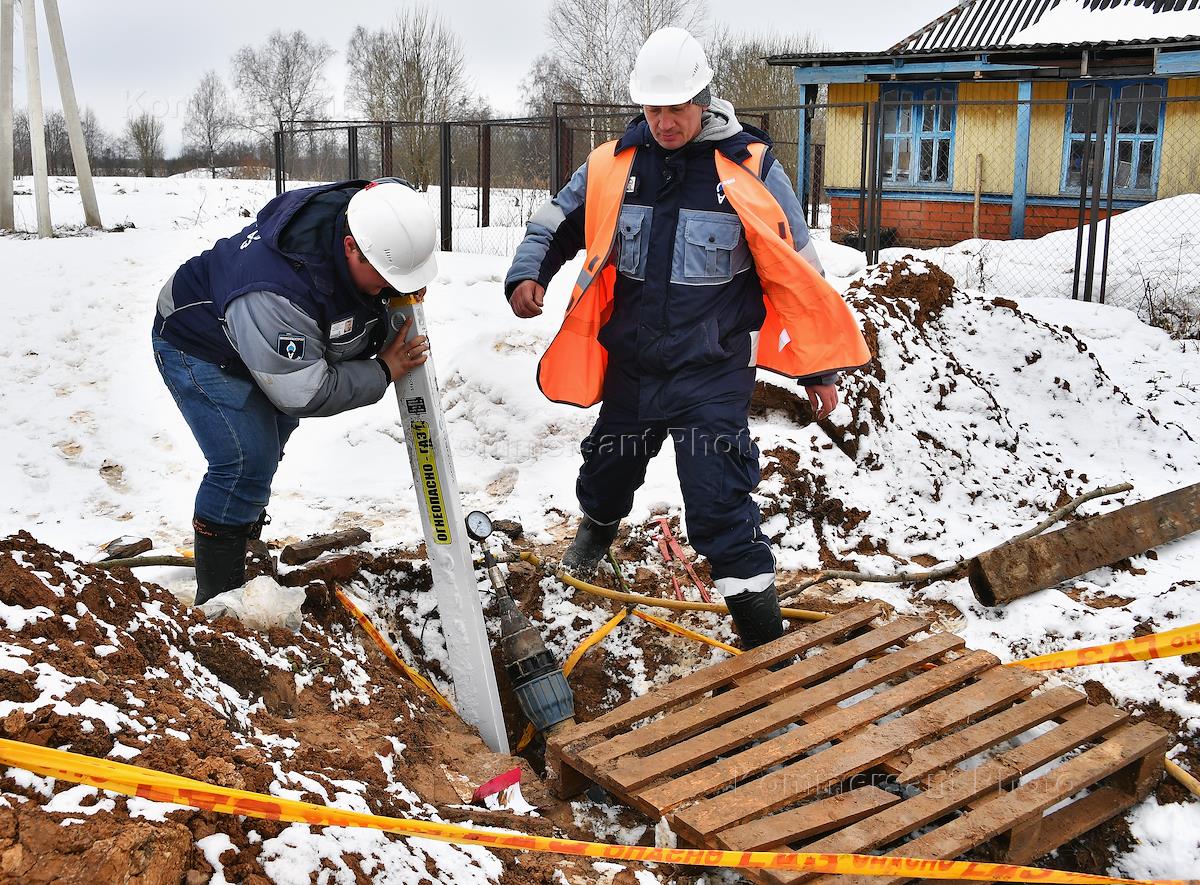 Программа социальной газификации в Московской области. Сотрудники компании "Мособлгазстрой" во время прокладки газовых труб и подключения домохозяйств к газораспределительным сетям в деревне Роща Наро-фоминского района.