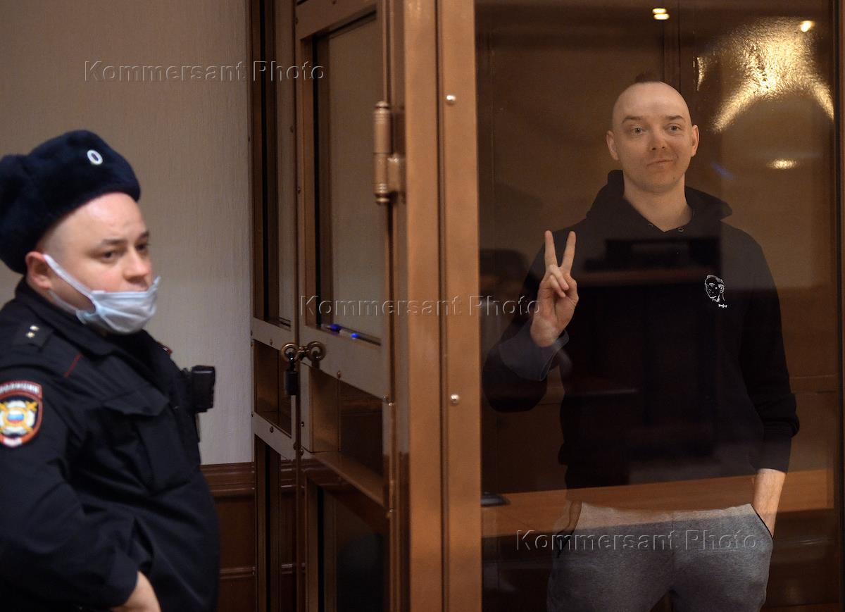Заседание суда по делу советника главы "Роскосмоса", бывшего журналиста газеты "Коммерсантъ" Ивана Сафронова, обвиняемого в государственной измене в Московском городском суде. Советник главы "Роскосмоса", бывший журналист газеты "Коммерсантъ" Иван Сафронов во время суда.