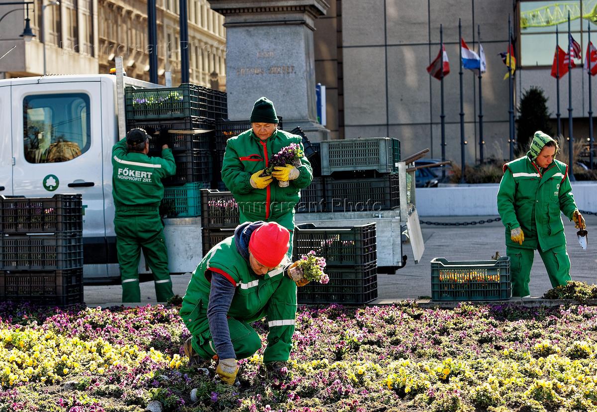 Виды Будапешта. Жанровая фотография. Высадка рассады цветов на клумбу в центре города.