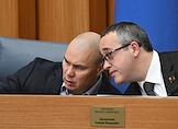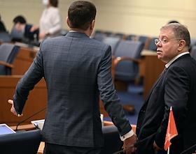 Заседание Моcковской городской думы (Мосгордумы). Председатель Московской городской думы Алексей Шапошников (слева) и депутат Мосгордумы Степан Орлов (в центре) во время заседания.