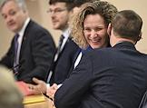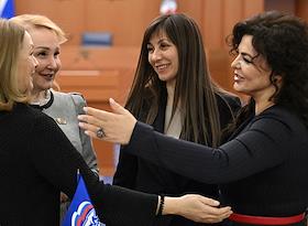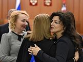 Заседание Моcковской городской думы (Мосгордумы). Слева направо: депутаты Мосгордумы Маргарита Русецкая, Елена Самышина, Лариса Картавцева и Елена Николаева перед началом заседания.