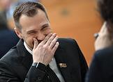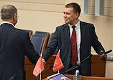 Заседание Моcковской городской думы (Мосгордумы). Депутат Мосгордумы Степан Орлов (справа) перед началом заседания.
