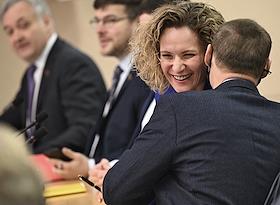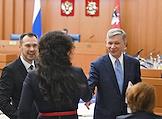 Заседание Моcковской городской думы (Мосгордумы). Слева направо: депутаты Мосгордумы Елена Самышина, Евгений Герасимов и Степан Орлов перед началом заседания.
