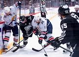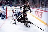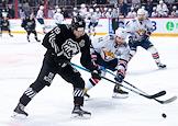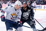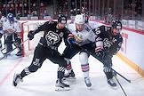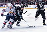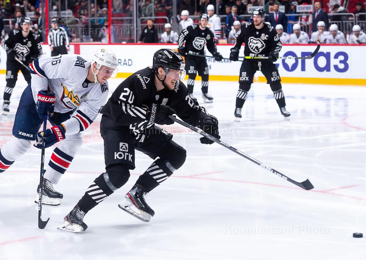 Континентальная хоккейная лига (КХЛ). Плей-офф. Финал-Восток. 1-й матч. Матч между командами "Трактор" (Челябинск) - "Металлург Мг" (Магнитогорск) на стадионе "Арена-Металлург". Игрок команды "Металлург Мг" Андрей Чибисов (в центре) и игрок команды "Трактор" Лоренс Пилут (справа) во время матча.