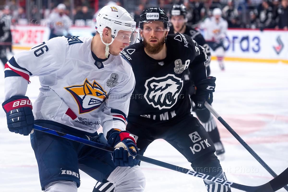 Континентальная хоккейная лига (КХЛ). Плей-офф. Финал-Восток. 1-й матч. Матч между командами "Трактор" (Челябинск) - "Металлург Мг" (Магнитогорск) на стадионе "Арена-Металлург". Игрок команды "Трактор" Владимир Ткачёв (слева) и игрок команды "Металлург Мг" Егор Яковлев (в центре) во время матча.