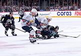 Континентальная хоккейная лига (КХЛ). Плей-офф. Финал-Восток. 1-й матч. Матч между командами "Трактор" (Челябинск) - "Металлург Мг" (Магнитогорск) на стадионе "Арена-Металлург". Игрок команды "Металлург Мг" Филипп Майе и игрок команды "Трактор" Владимир Ткачёв (в центре) во время матча.