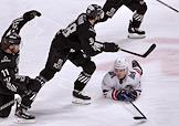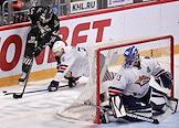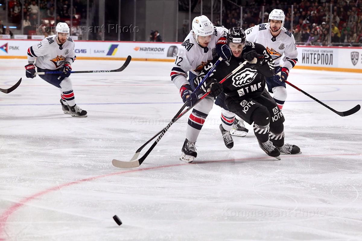 Континентальная хоккейная лига (КХЛ). Плей-офф. Финал-Восток. 4-й матч. Матч между командами "Трактор" (Челябинск) - "Металлург Мг" (Магнитогорск) на стадионе "Арена-Металлург". Игрок команды "Металлург" Григорий Дронов (в центре) во время матча.