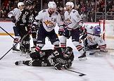 Континентальная хоккейная лига (КХЛ). Плей-офф. Финал-Восток. 4-й матч. Матч между командами "Трактор" (Челябинск) - "Металлург Мг" (Магнитогорск) на стадионе "Арена-Металлург". Игроки команды "Металлург" во время матча.