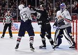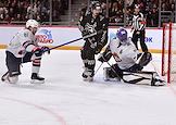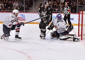 Континентальная хоккейная лига (КХЛ). Плей-офф. Финал-Восток. 4-й матч. Матч между командами "Трактор" (Челябинск) - "Металлург Мг" (Магнитогорск) на стадионе "Арена-Металлург". Слева направо: игрок команды "Трактор" Сергей Калинин, игрок команды "Металлург" Денис Зернов и вратарь команды "Металлург Василий Кошечкин во время матча.
