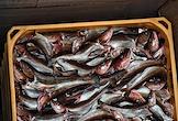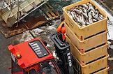 Пресс-тур на предприятия рыбопромышленного холдинга "Norebo". Рыба в пластиковых ящиках во время перегрузки с рыболовного судна на причал береговой рыбоперерабатывающей фабрики Borealis, входящей в состав холдинга.