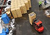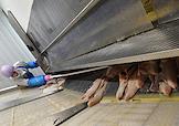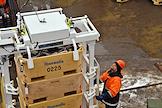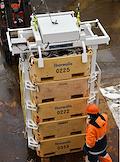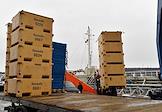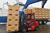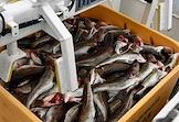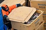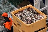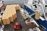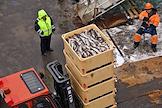 Пресс-тур на предприятия рыбопромышленного холдинга "Norebo". Обработанная рыба в пластиковых ящиках во время перегрузки с рыболовного судна на причал береговой рыбоперерабатывающей фабрики Borealis, входящей в состав холдинга.