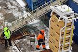 Пресс-тур на предприятия рыбопромышленного холдинга "Norebo". Рыба в пластиковых ящиках во время перегрузки с рыболовного траулера "Кильдин" на причал береговой рыбоперерабатывающей фабрики Borealis, входящей в состав холдинга.