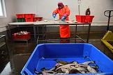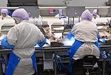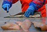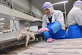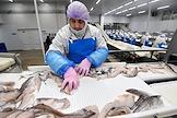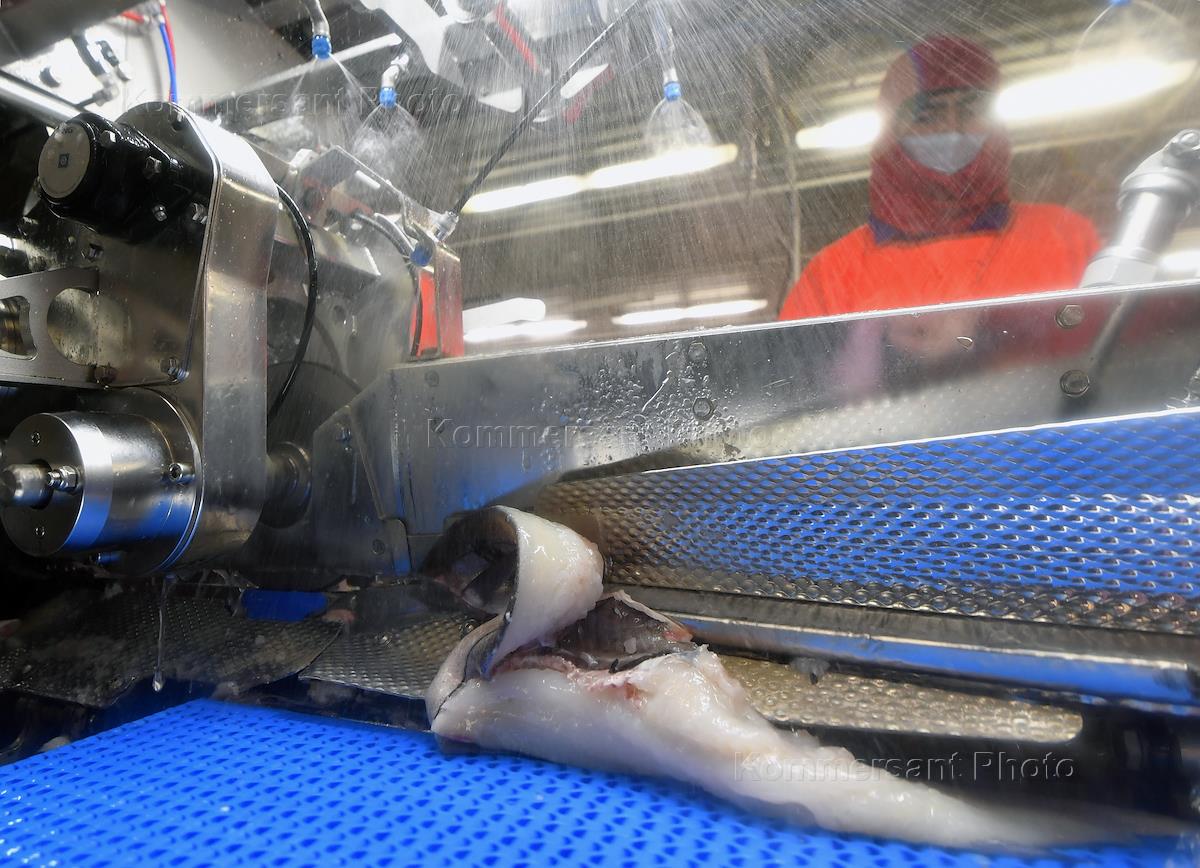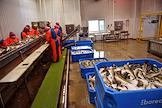 Пресс-тур на предприятия рыбопромышленного холдинга Norebo. Жанровая фотография. Работа береговой рыбоперерабатывающой фабрики Borealis. Разделочная линия фабрики.