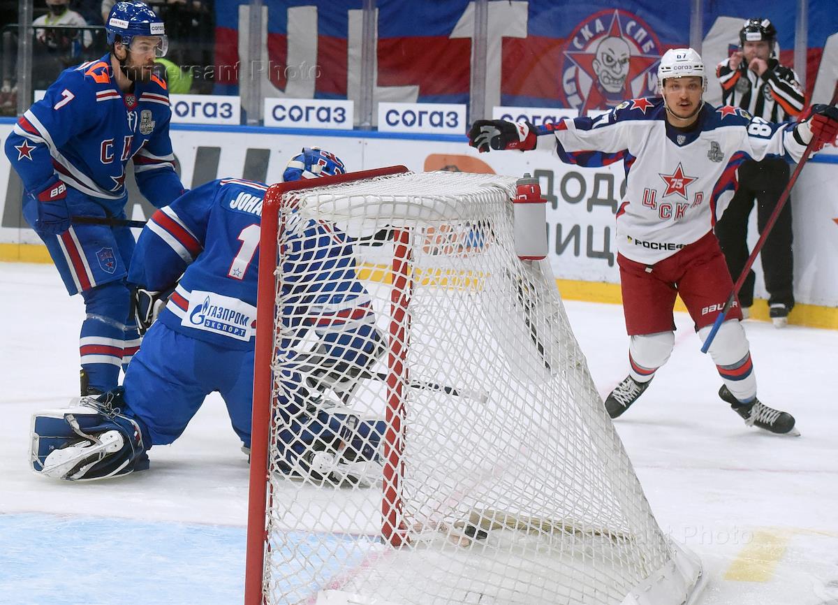 Континентальная хоккейная лига (КХЛ). Чемпионат сезона 2021/22. Финал - Запад. 5-й матч. Матч между командами СКА (Санкт-Петербург) - ЦСКА (Москва) на стадионе "Ледовый дворец". Игрок команды ЦСКА Александр Попов (второй слева) во время матча.