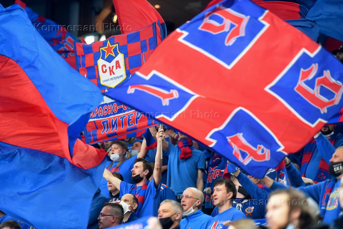 Континентальная хоккейная лига (КХЛ). Чемпионат сезона 2021/22. Финал - Запад. 5-й матч. Матч между командами СКА (Санкт-Петербург) - ЦСКА (Москва) на стадионе "Ледовый дворец". Болельщики команды СКА на зрительской трибуне во время матча.