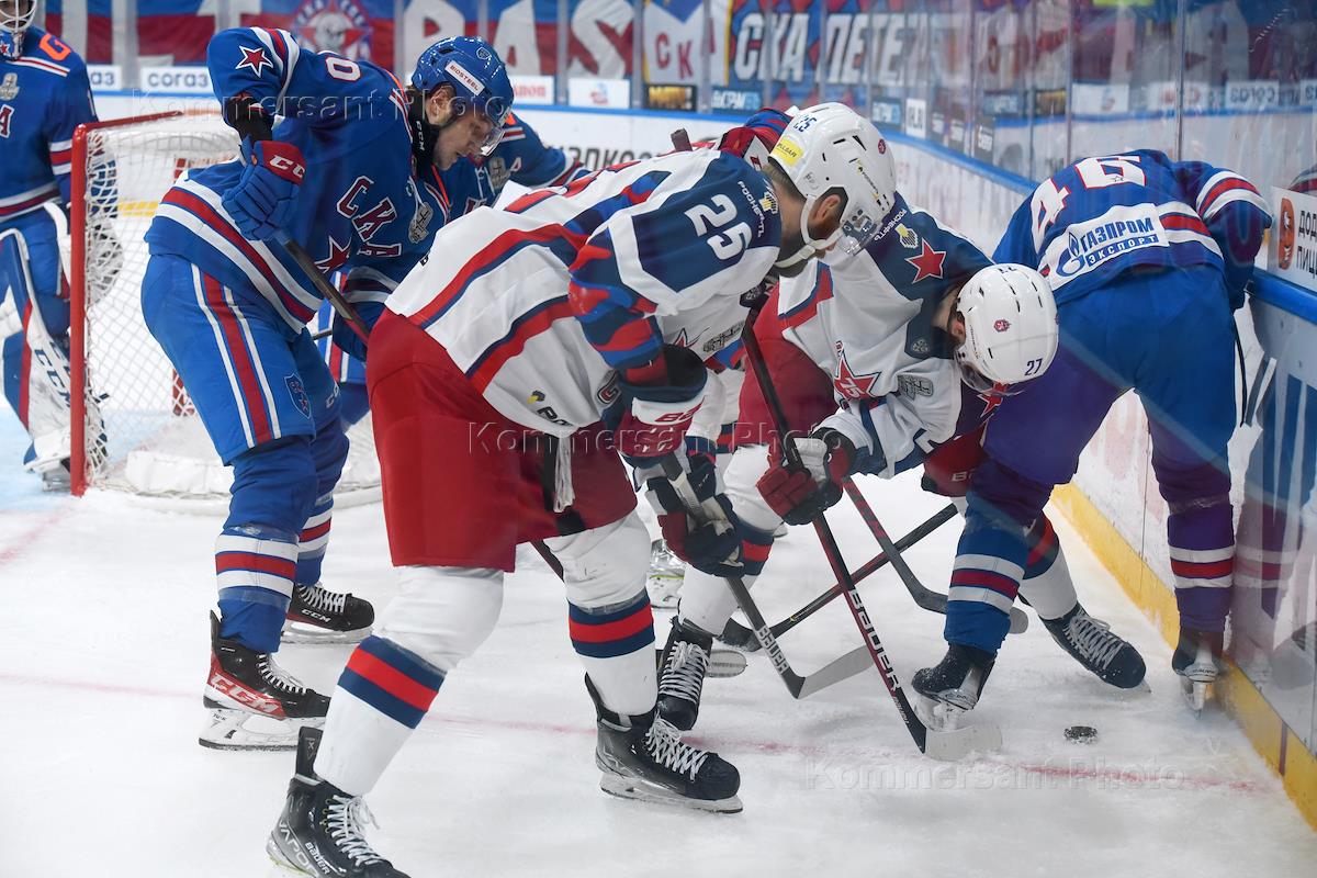 Континентальная хоккейная лига (КХЛ). Чемпионат сезона 2021/22. Финал - Запад. 5-й матч. Матч между командами СКА (Санкт-Петербург) - ЦСКА (Москва) на стадионе "Ледовый дворец". Игрок команды СКА Оскар Фантенберг (второй слева) во время матча.
