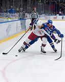 Континентальная хоккейная лига (КХЛ). Чемпионат сезона 2021/22. Финал - Запад. 5-й матч. Матч между командами СКА (Санкт-Петербург) - ЦСКА (Москва) на стадионе "Ледовый дворец". Игрок команды ЦСКА Сергей Андронов (слева) и игрок команды СКА Валентин Зыков (справа) во время матча.