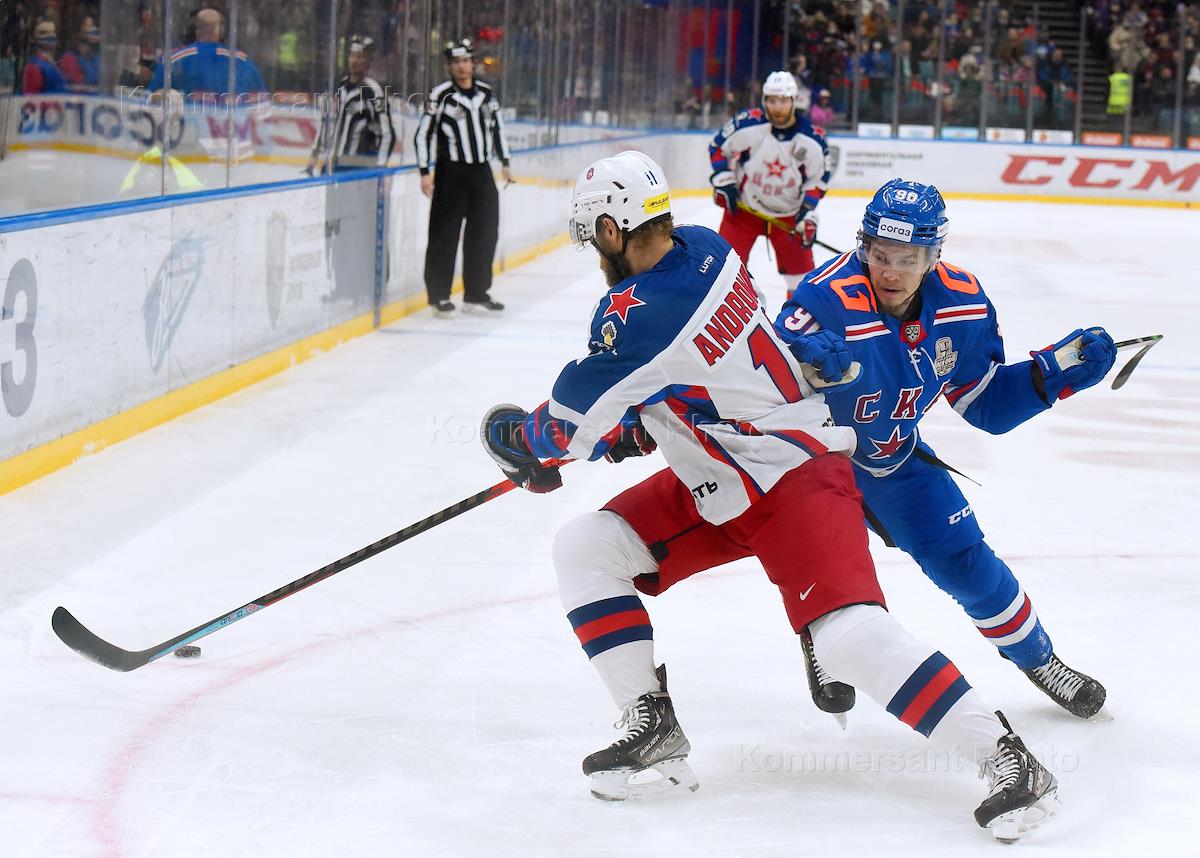 Континентальная хоккейная лига (КХЛ). Чемпионат сезона 2021/22. Финал - Запад. 5-й матч. Матч между командами СКА (Санкт-Петербург) - ЦСКА (Москва) на стадионе "Ледовый дворец". Игрок команды ЦСКА Сергей Андронов (слева) во время матча.