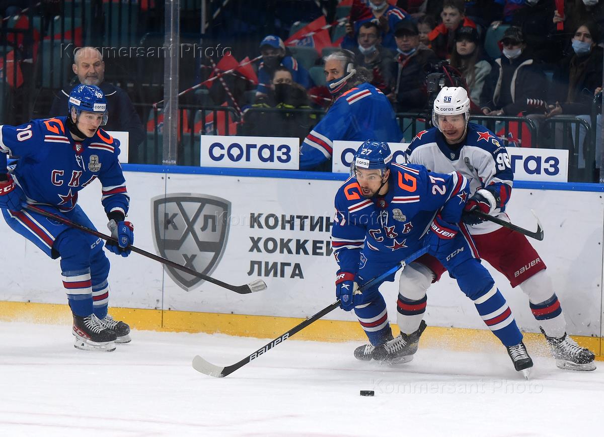 Континентальная хоккейная лига (КХЛ). Чемпионат сезона 2021/22. Финал - Запад. 5-й матч. Матч между командами СКА (Санкт-Петербург) - ЦСКА (Москва) на стадионе "Ледовый дворец". Игрок команды СКА Оскар Фантенберг (второй слева) во время матча.
