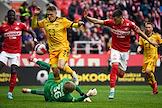 Российская Премьер-Лига (РПЛ). Тинькофф - Чемпионат России по футболу 2021/2022. 24-й тур. Матч между командами "Спартак" (Москва) - "Арсенал" (Тула) на стадионе "Открытие Арена". Вратарь команды "Арсенал" Михаил Левашов (второй слева) и игрок команды "Спартак" Александр Соболев (третий справа) во время матча.