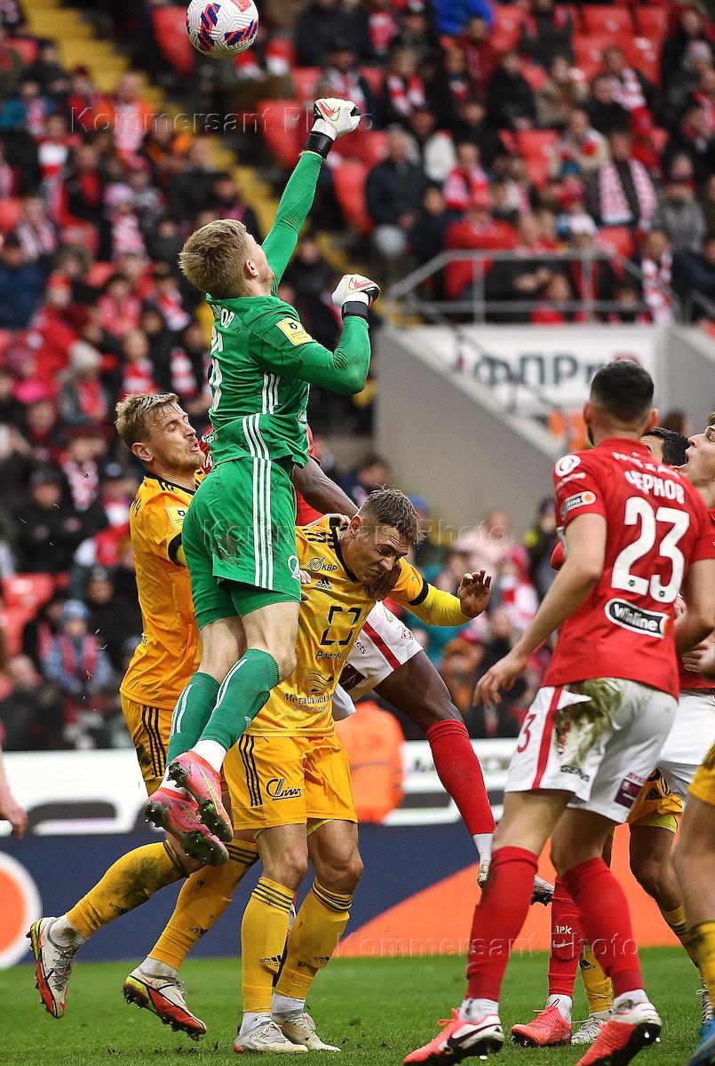 Российская Премьер-Лига (РПЛ). Тинькофф - Чемпионат России по футболу 2021/2022. 24-й тур. Матч между командами "Спартак" (Москва) - "Арсенал" (Тула) на стадионе "Открытие Арена". Вратарь команды "Спартак" Александр Максименко (в центре) во время матча.