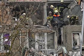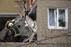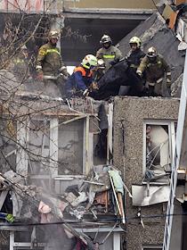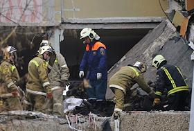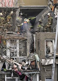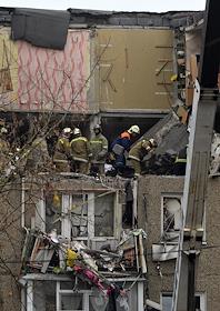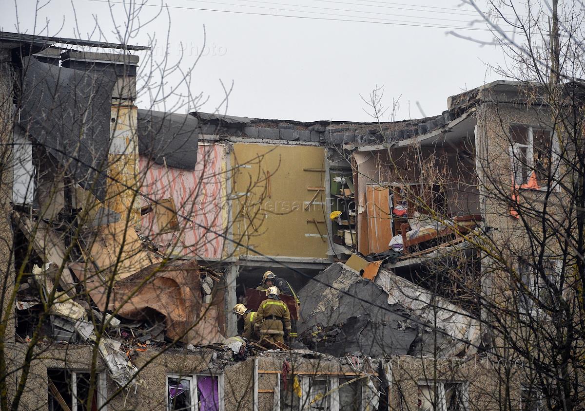 Последствия взрыва бытового газа в пятиэтажном жилом доме №4 по Центральному переулку. Сотрудники МЧС России во время проведения спасательной операции на месте взрыва.