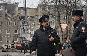 Последствия взрыва бытового газа в пятиэтажном жилом доме №4 по Центральному переулку. Сотрудники полиции во время оцепления места взрыва.