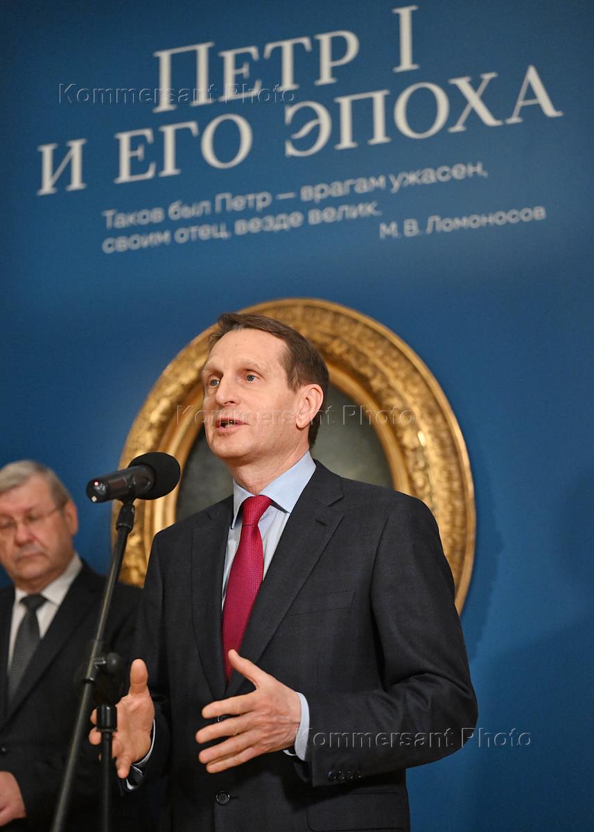 Церемония открытия историко-документальной выставки "Петр I и его эпоха", посвященной 350-летию со дня рождения царя-самодержца, в Выставочном зале федеральных архивов. Председатель Российского исторического общества, директор Службы внешней разведки Сергей Нарышкин на церемонии.