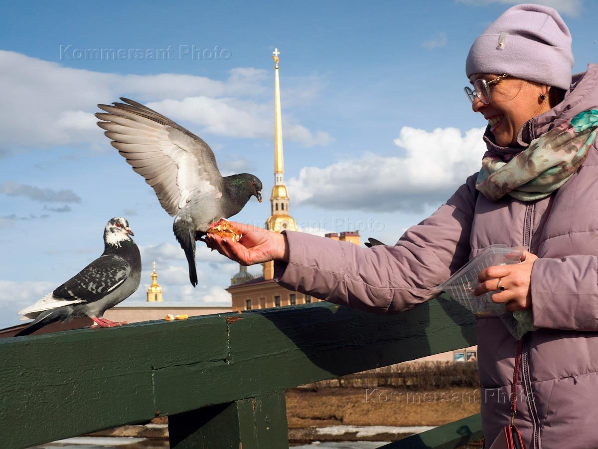 Виды Санкт-Петербурга. Петропавловская крепость. Жанровая фотография. Женщина кормит голубей.