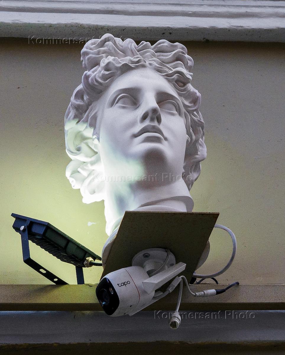 Views of St. Petersburg. Genre photography. Crystal chandelier outside the window.