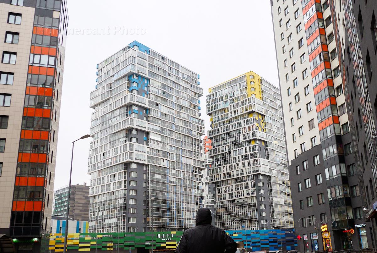 Views of St. Petersburg. Genre photography. Residential houses of the Yuzhnoye Kudrovo district.