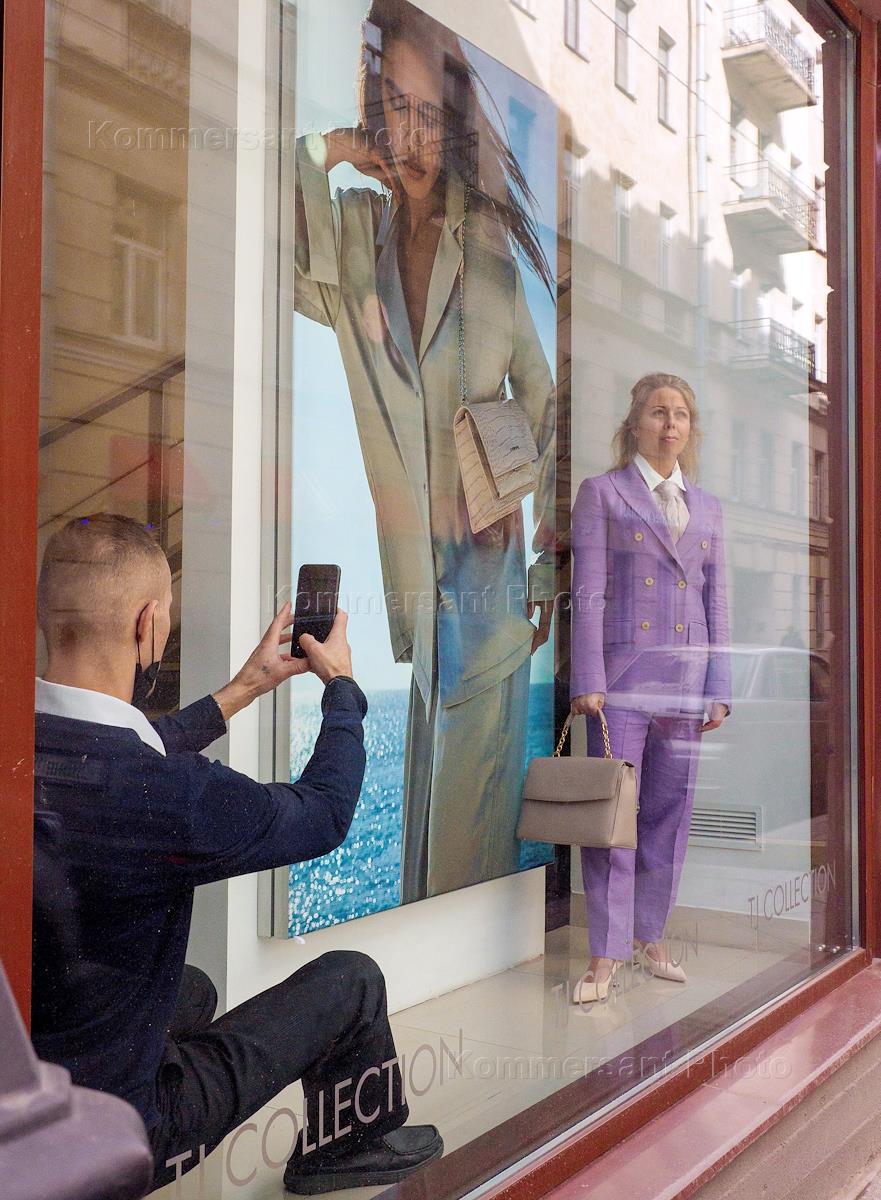 Genre photography. A man takes a picture of a woman in a shop window "TJ Collection" on a mobile phone.