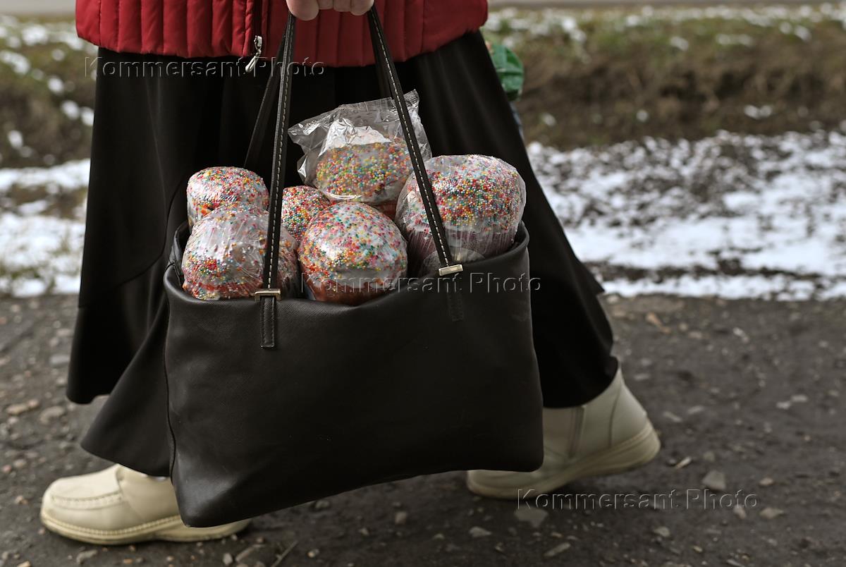 Виды Тары. Жанровая фотография. Подготовка к Пасхе. Женщина несет в сумке пасхальные куличи.
