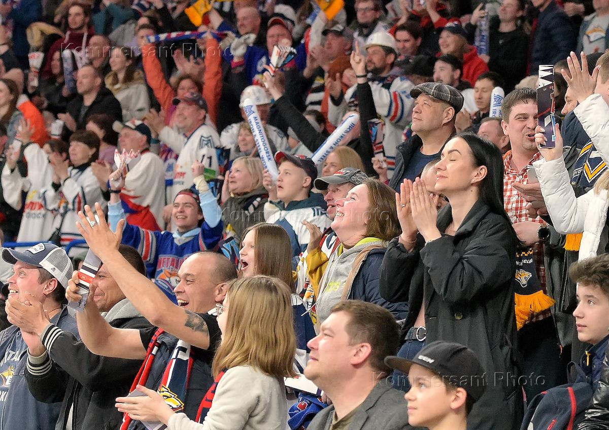 Континентальная хоккейная лига (КХЛ). Плей-офф. Финал-Восток. 2-й матч. Матч между командами "Металлург Мг" (Магнитогорск) - "Трактор" (Челябинск) на стадионе "Арена-Металлург". Болельщики на трибуне во время матча.