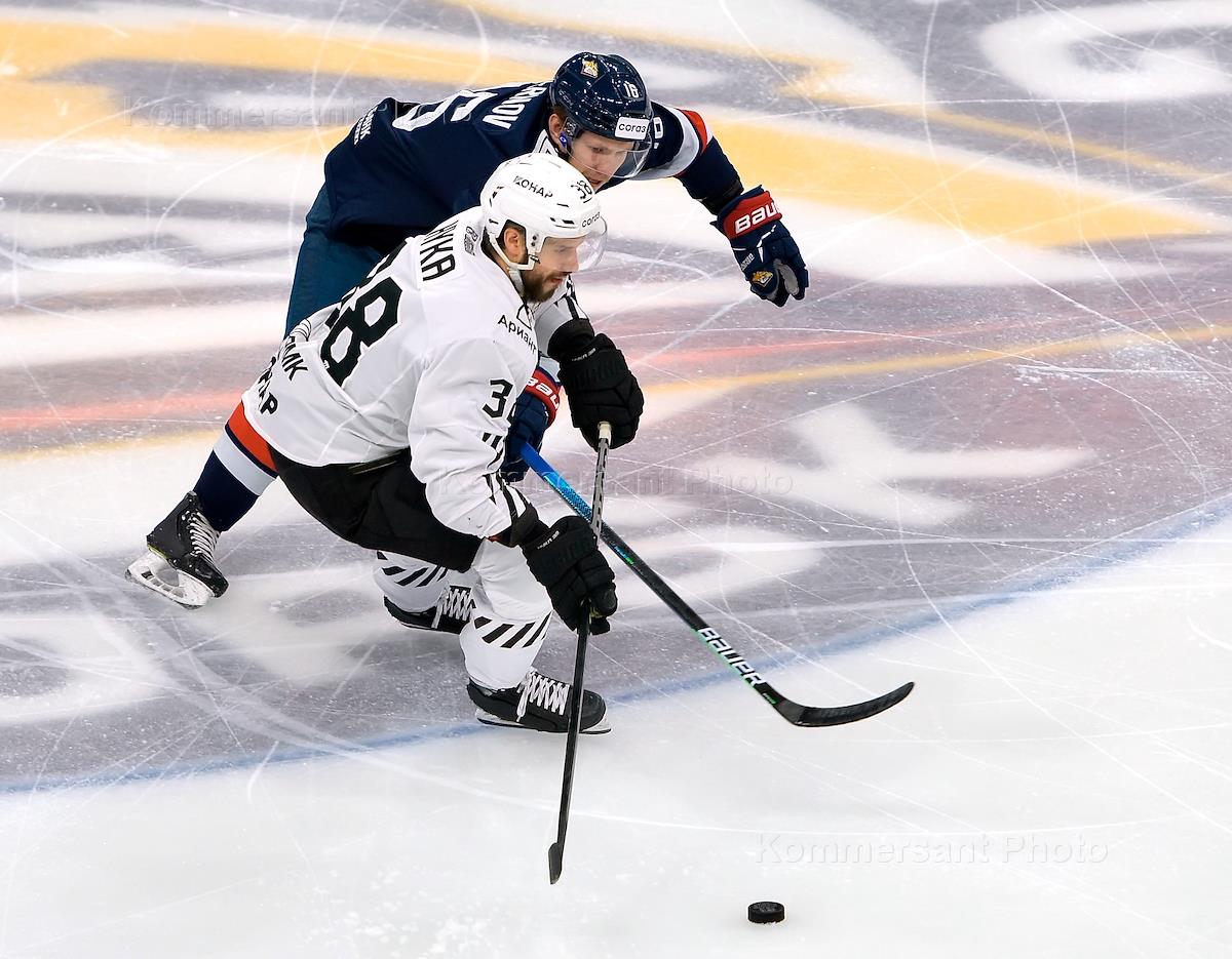 Континентальная хоккейная лига (КХЛ). Плей-офф. Финал-Восток. 2-й матч. Матч между командами "Металлург Мг" (Магнитогорск) - "Трактор" (Челябинск) на стадионе "Арена-Металлург". Игрок команды "Металлург Мг" Николай Голдобин (справа) и игрок команды "Трактор" Кирилл Капустин (слева) во время матча.