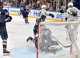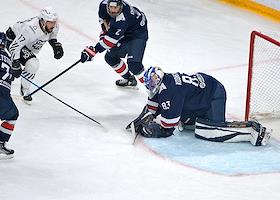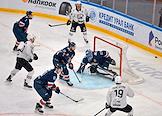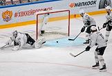 Континентальная хоккейная лига (КХЛ). Плей-офф. Финал-Восток. 2-й матч. Матч между командами "Металлург Мг" (Магнитогорск) - "Трактор" (Челябинск) на стадионе "Арена-Металлург". Вратарь команды "Трактор" Роман Вилл (в центре) во время матча.