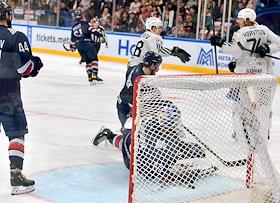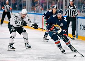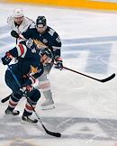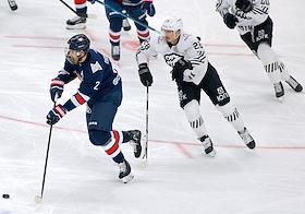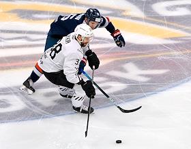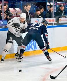 Континентальная хоккейная лига (КХЛ). Плей-офф. Финал-Восток. 2-й матч. Матч между командами "Металлург Мг" (Магнитогорск) - "Трактор" (Челябинск) на стадионе "Арена-Металлург". Игроки команды "Металлург" Роман Вилл (слева) во время матча.