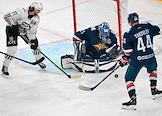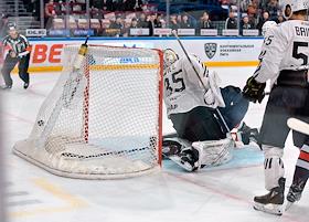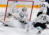 Континентальная хоккейная лига (КХЛ). Плей-офф. Финал-Восток. 2-й матч. Матч между командами "Металлург Мг" (Магнитогорск) - "Трактор" (Челябинск) на стадионе "Арена-Металлург". Вратарь команды "Трактор" Роман Вилл (слева) во время матча.