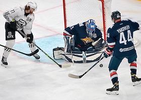 Континентальная хоккейная лига (КХЛ). Плей-офф. Финал-Восток. 2-й матч. Матч между командами "Металлург Мг" (Магнитогорск) - "Трактор" (Челябинск) на стадионе "Арена-Металлург". Вратарь команды "Металлург Мг" Василий Кошечкин (справа) во время матча.