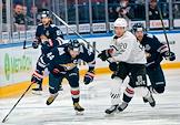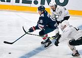 Континентальная хоккейная лига (КХЛ). Плей-офф. Финал-Восток. 2-й матч. Матч между командами "Металлург Мг" (Магнитогорск) - "Трактор" (Челябинск) на стадионе "Арена-Металлург". Игроки команды "Металлург Мг" Василий Кошечкин (в центре), Егор Яковлев (справа) и игрок команды "Трактор" Лукаш Седлак (слева) во время матча.