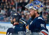 Континентальная хоккейная лига (КХЛ). Плей-офф. Финал-Восток. 2-й матч. Матч между командами "Металлург Мг" (Магнитогорск) - "Трактор" (Челябинск) на стадионе "Арена-Металлург". Игроки команды "Металлург Мг" Василий Кошечкин (справа) и Егор Яковлев (слева) после матча.