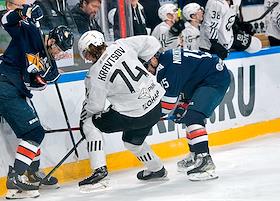 Континентальная хоккейная лига (КХЛ). Плей-офф. Финал-Восток. 2-й матч. Матч между командами "Металлург Мг" (Магнитогорск) - "Трактор" (Челябинск) на стадионе "Арена-Металлург". Игрок команды "Металлург Мг" Денис Зернов (справа), игроки команды "Трактор" Никита Тертышный (в центре) и Сергей Калинин (справа) во время матча.